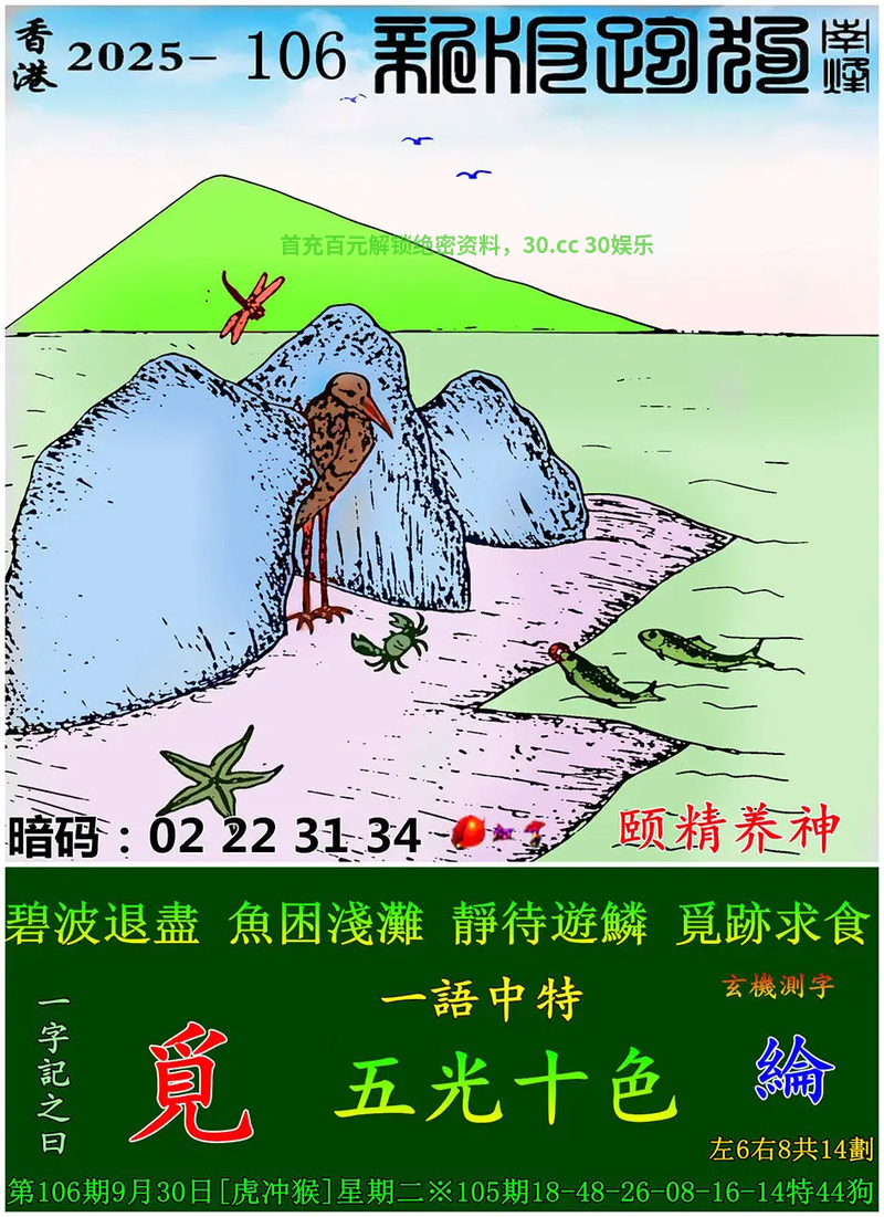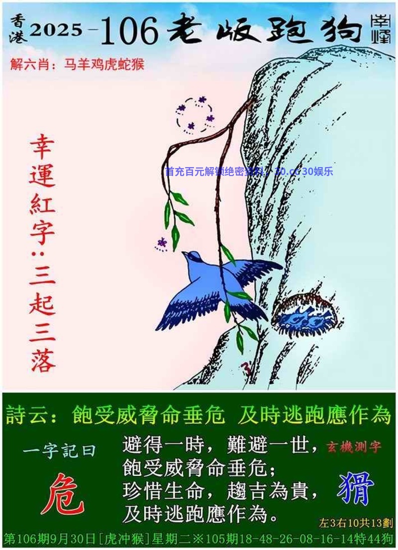 105期:马会传真解析: 今期生肖胆真大,不须劳苦能获利 奔月而去伴嫦娥,龙虎相争必一伤 相合即中指六七,书香门第声明扬 泉眼无声声细流,二三春意知几许 十面埋伏 解析:今期生肖胆真大,不须劳苦能获利,胆大肖猪虎牛马猴狗,奔月而去伴嫦娥,龙虎相争必一伤,明肖龙虎,相合即中指六七,书香门第声明扬,书肖虎龙马,泉眼无声声细流,二三春意知几许,23羊。 综合:猪虎牛马猴狗龙羊兔 |